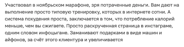 В негативных отзывах обычно сетуют на то, что вес вернулся сразу после окончания марафона, советы по питанию и тренировкам выдаются шаблонные, не учитывающие индивидуальные особенности и пожелания.