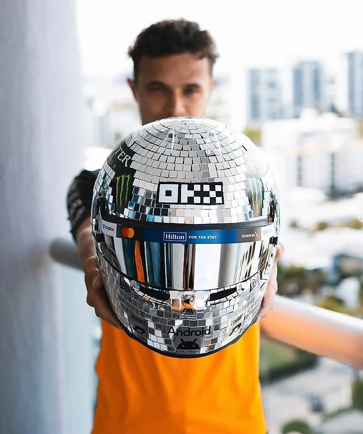 Яркие шлемы – фишка пилота «Макларен» Ландо Норриса. Новый турнир – новый шлем. Ландо представил новый диско-шлем специально к Гран-при Майами.