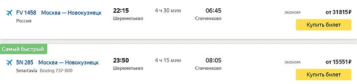 Первый рейс SU 1458/FV 1458 авиакомпании «Аэрофлот»/«Россия» вылетает в 22:15, второй обслуживает авиакомпания Smartavia, вылет в 23:50. Стоимость билетов на эти рейсы отличается в два раза. В первом случае эконом-классом можно добраться до Новокузнецка за 31 815 рублей, во втором за 15 551 рубль. Время в пути – около четырех с половиной часов.