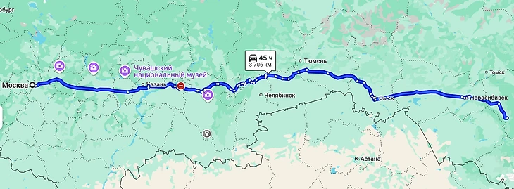 На автомобиле добраться из Москвы до Новокузнецка можно за 45 часов, преодолев расстояние чуть больше 3 700 километров, если не останавливаться на отдых. Реальное время поездки займет не менее трех суток.