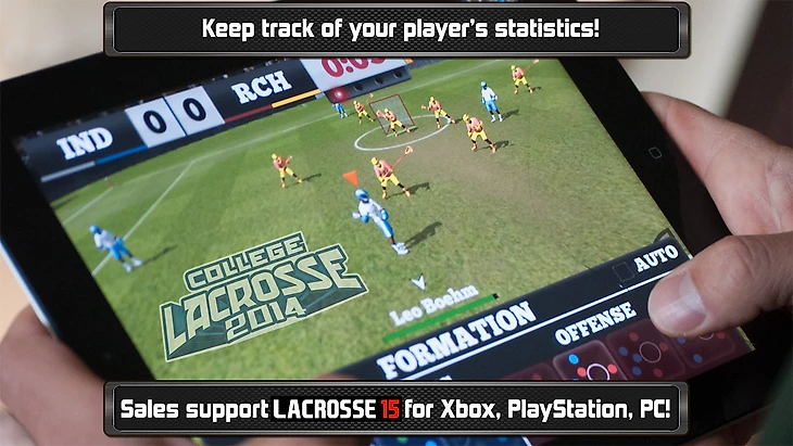 «В первой в истории видеоигре по лакроссу для iOS и Android College Lacrosse 2014 вы сможете насладиться настоящим игровым процессом лакросса на своих мобильных устройствах. Вбрасывания, броски, пасы, ‘чеки‘, граунд-болы, уклонения и многое другое!»