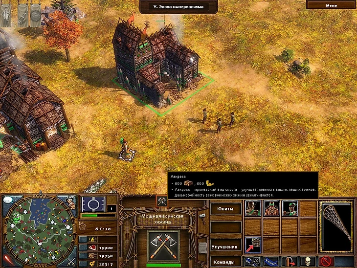 Age of Empires III (2005). На одной из кнопок изображена клюшка для игры. «Лакросс — ирокезский вид спорта — улучшает ловкость ваших пеших воинов. Дальнобойность всех воинских хижин увеличивается».