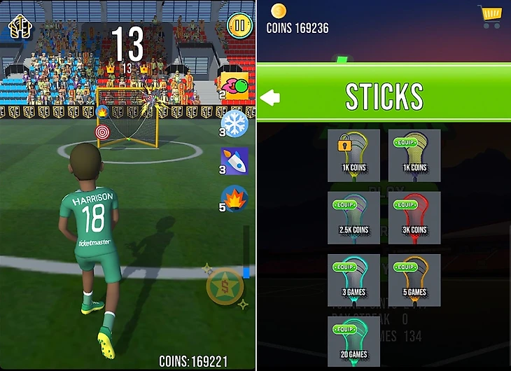 «Вы собираете монеты после каждой игры в PLL Top Shelf, зарабатывая одну монету за каждое попадание в цель. Эти монеты можно использовать для покупки клюшек и других персонажей. Вы начинаете игру с Кайлом Харрисоном, но вы можете использовать монеты для покупки Пола Рабиля, Мэтта Рэмбо, Майлза Джонса, Джоша Бирна, Колина Хикока, Гранта Амента, Брайана Костабайла и Райана Брауна. У каждого игрока есть домашний, выездной и джерси PLL All-Star 2019. Вы также можете купить клюшки, которые предназначены только для эстетических целей, и вы также можете заработать клюшки, если будете играть определенное количество дней подряд».