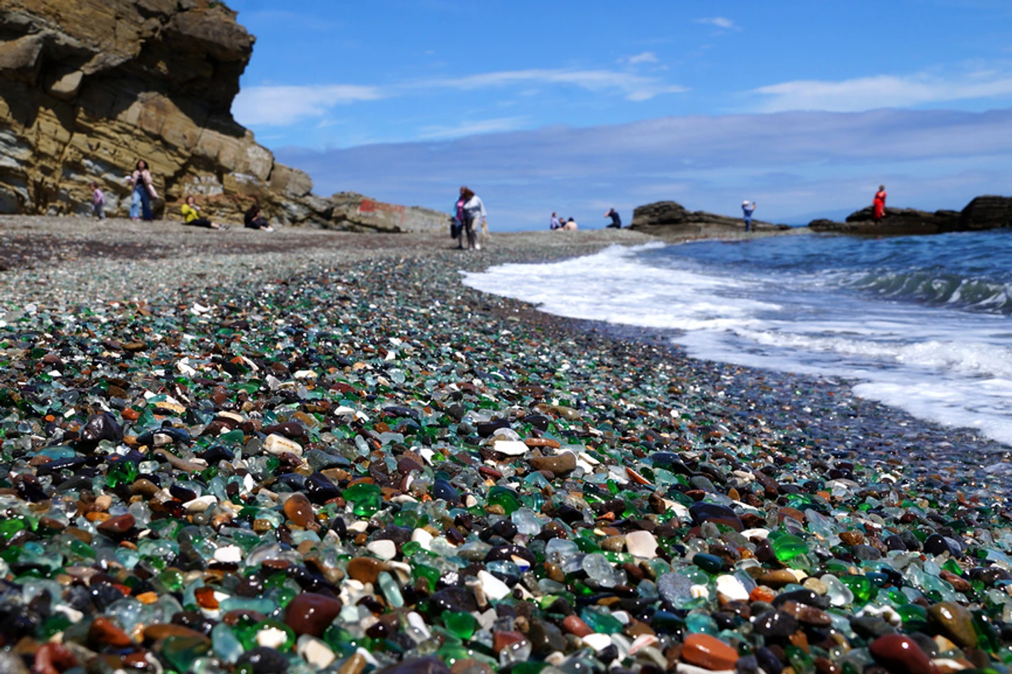 Лазурная бухта находится чуть севернее от города, а Стеклянная ближе к нему и южнее от Шаморы. Пляж здесь не очень большой и менее благоустроенный, но поражает своей красотой. Все знакомы с галечными и песчаными пляжами, а тут он в прямом смысле слова стеклянный. Море во Владивостоке многие годы обкатывало своими волнами разноцветное стекло на берегу. Когда светит солнце, появляются блики, и складывается впечатление, что идешь по сказочным самоцветам. Пляж дикий, но славится своей красотой и считается одним из лучших, где следует побывать.
