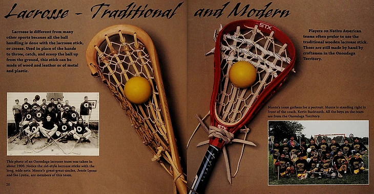 «Клюшки того периода вполне могли быть ракетками с туго натянутыми поверхностями, а не карманами более поздних индейских палок. Еще недавно старейшина племени сенека описал «старую» форму их палки как имеющую настолько тугую перепонку, что игроку приходилось останавливать мяч в воздухе своей ракеткой, подбирать его с земли палкой, подбрасывать его обратно в воздух и отбивать его товарищу по команде».