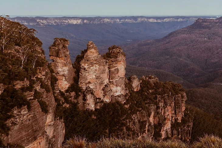 Голубые горы и Три сестры (Blue Mountains & Three Sisters), Новый Южный Уэльс. Классика природных ландшафтов Австралии: густые эвкалиптовые леса, синие туманы и символ региона — три скальных пики, будто охраняющие ущелья. Здесь красиво в любую погоду.