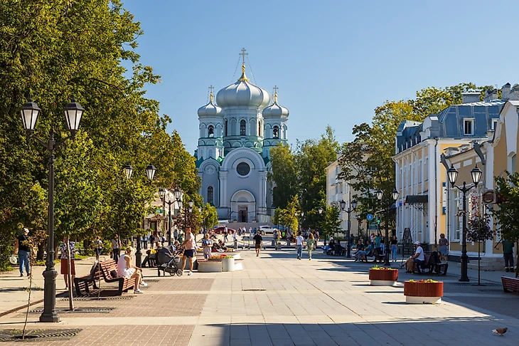 Город Гатчина, Ленинградская область, Россия. Вид на Соборную улицу и Павловский кафедральный собор. Пешеходная улица в историческом центре Гатчины. Горожане гуляют по улице и отдыхают на скамейках. Гатчина является административным центром Ленинградской области. © Андрей Степанов / Фотобанк Лори