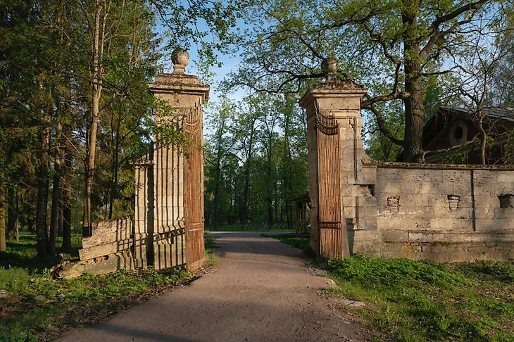 View of the Menagerie (Zverinskiye) Gate – stone gate to the Eagle Grove, between the Menagerie and the Palace Park in Gatchina Park on a sunny summer day, Gatchina, Leningrad region, Russia © Ula Ulachka / Фотобанк Лори