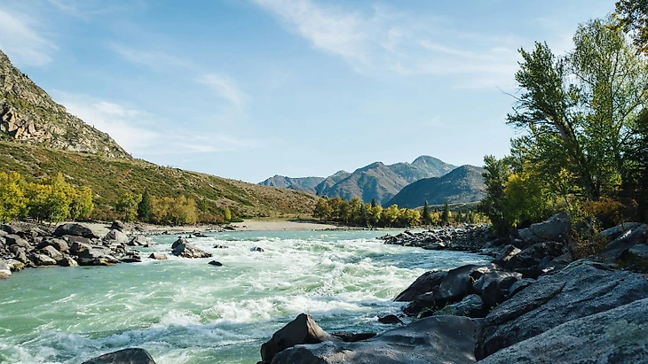 река Катунь привлекает лазурной водой и берегами, усыпанными листвой, а утренние туманы над водой создают сказочную атмосферу;
