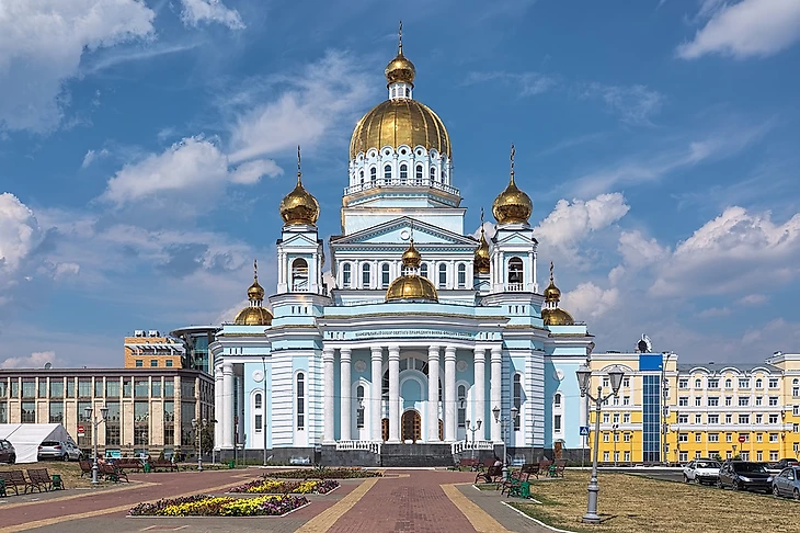 Один из символов города, главный храм Мордовии; эффектно выглядит на рассвете и в вечерней подсветке. |