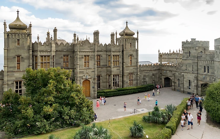 Алупка встречает запахом моря и хвои, и где-то между ними, у самого подножия Ай-Петри, скрыт Воронцовский дворец. Он странный и прекрасный — вроде бы английская строгость, но через арки и башни пробивается восточная мягкость. Южный фасад украшен мраморными львами, а северный будто сошел с иллюстрации к старинной британской легенде.