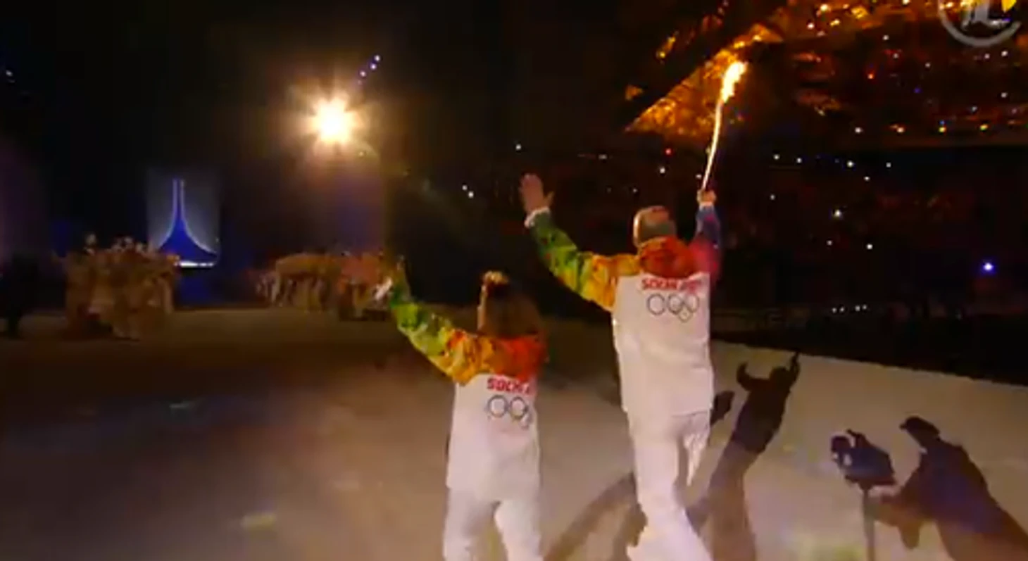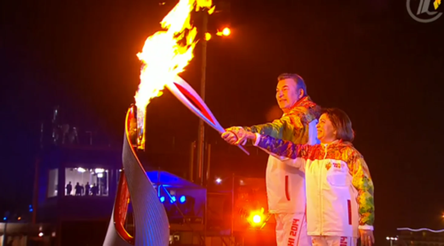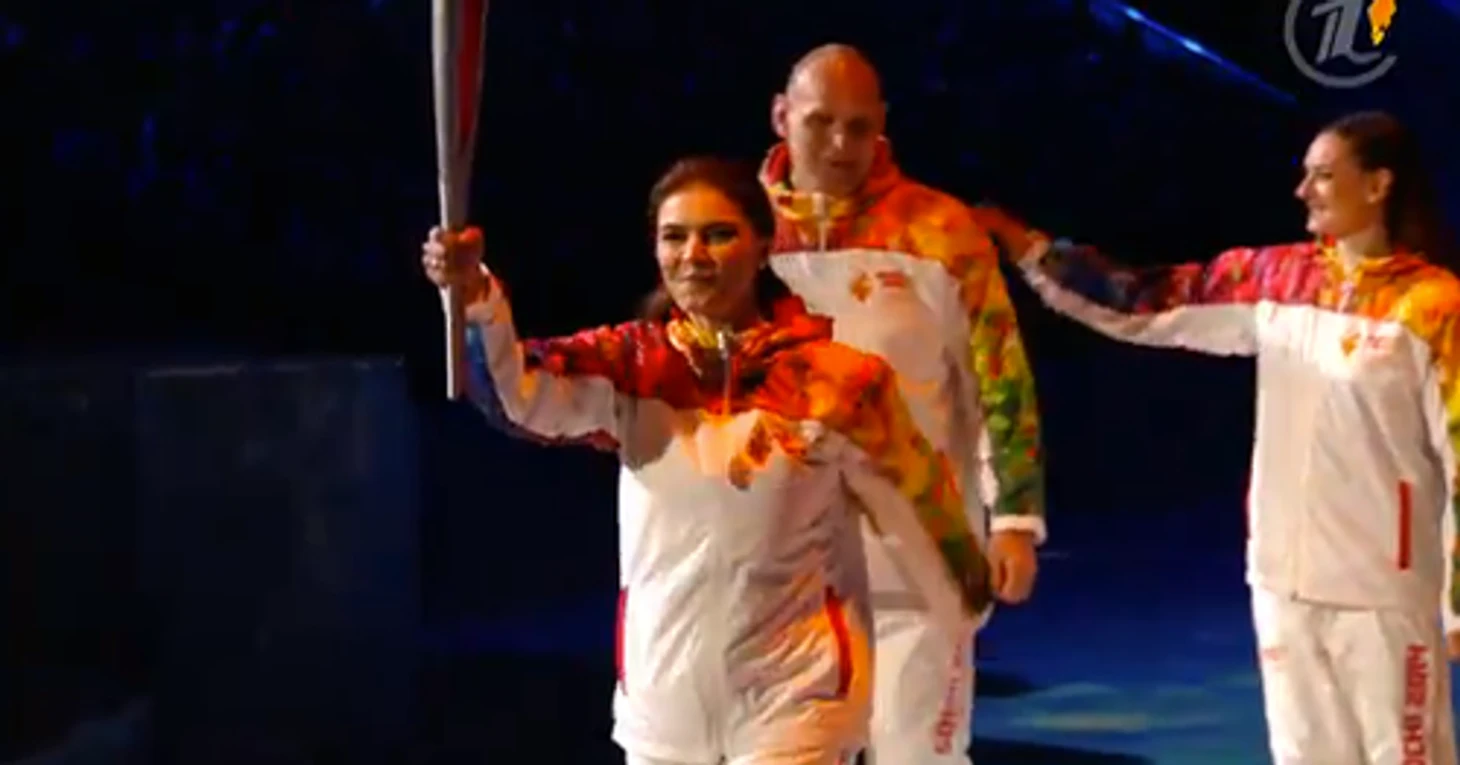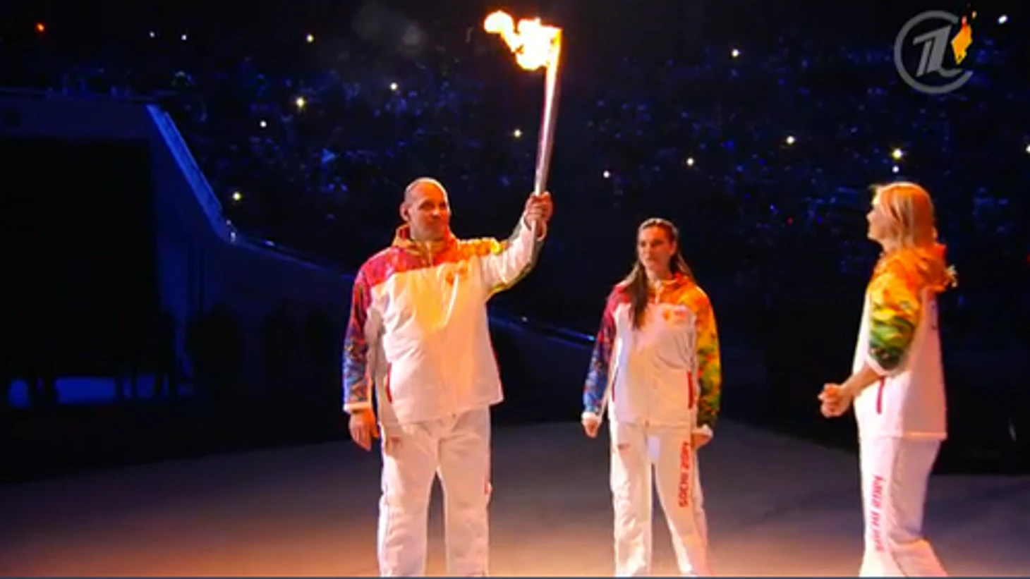 22.51 Четвертой, как мы и обещали, становится Алина Кабаева. Вместе с Шараповой, Исинбаевой и Карелиным она подносит огонь Ирине Родниной и Владиславу Третьяку.