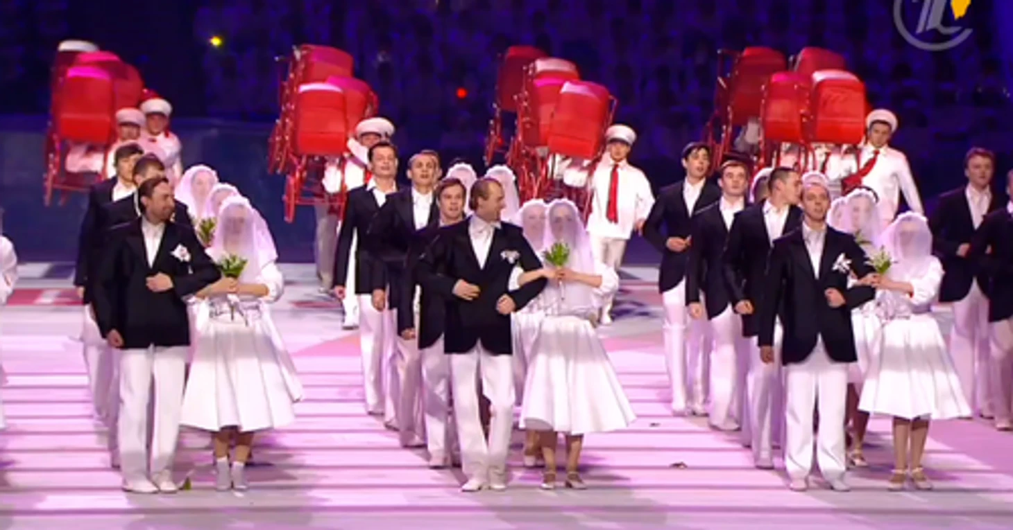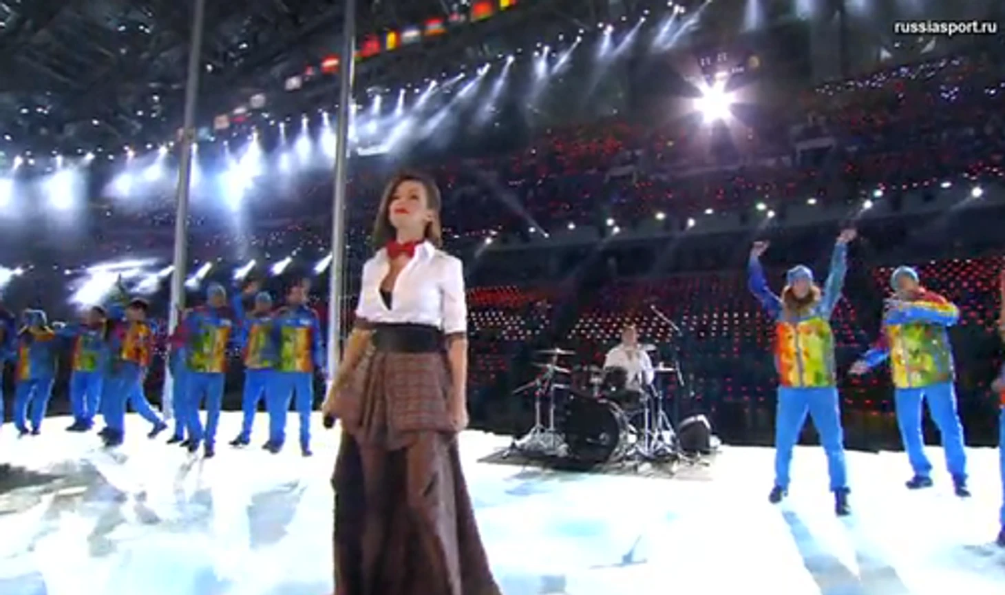 19.55 Вот и первый сюрприз! Группа «Тату» начала петь «Нас не догонят» еще до начала церемонии открытия. За солистками – подтанцовка в форме Bosco.