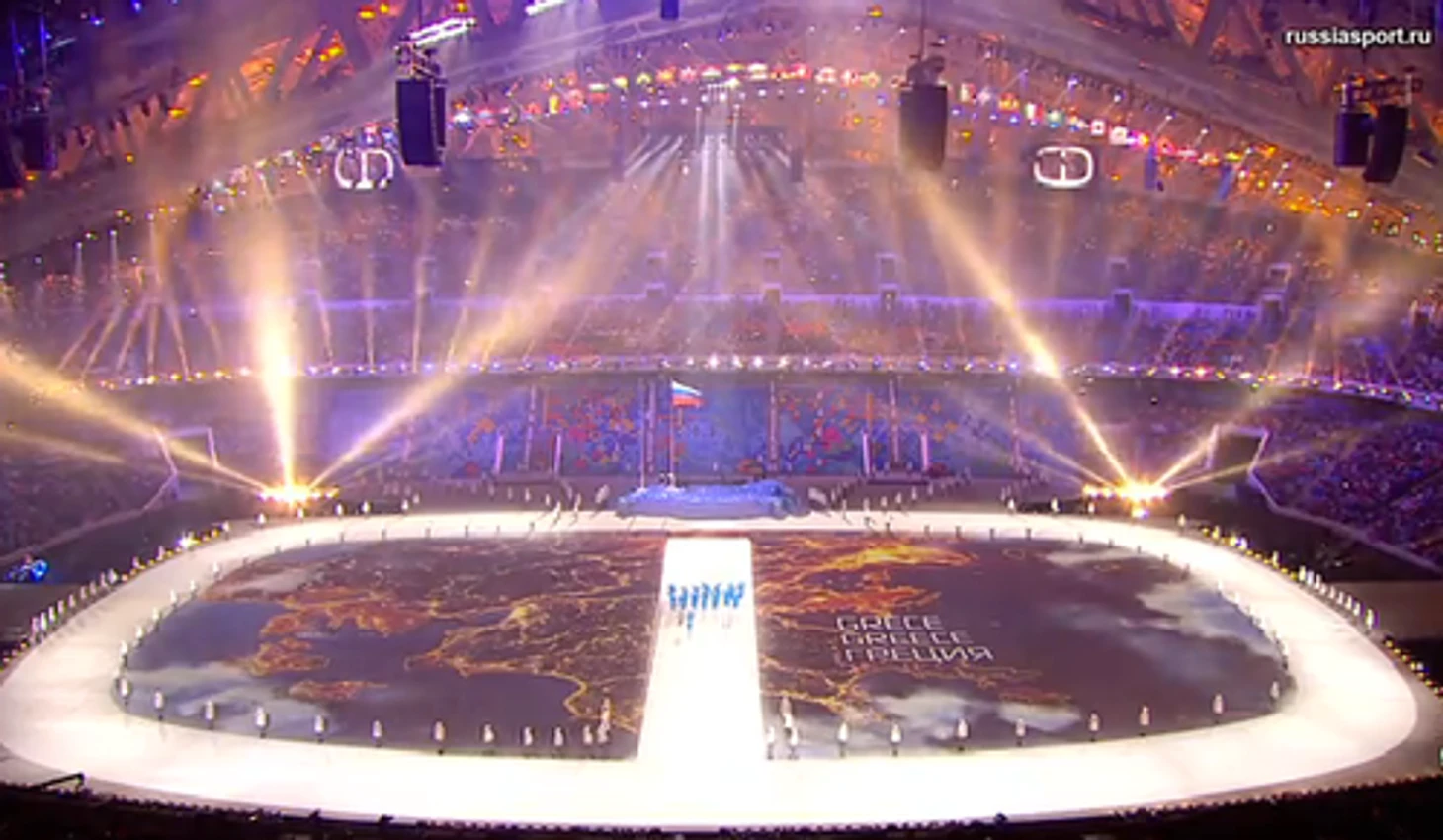 20.32 И вот та самая карта мира, нанесенная на центр стадиона, о которой говорил Константин Эрнст. Из сердца Греции, как родины Олимписких игр, выходят первые спортсмены.