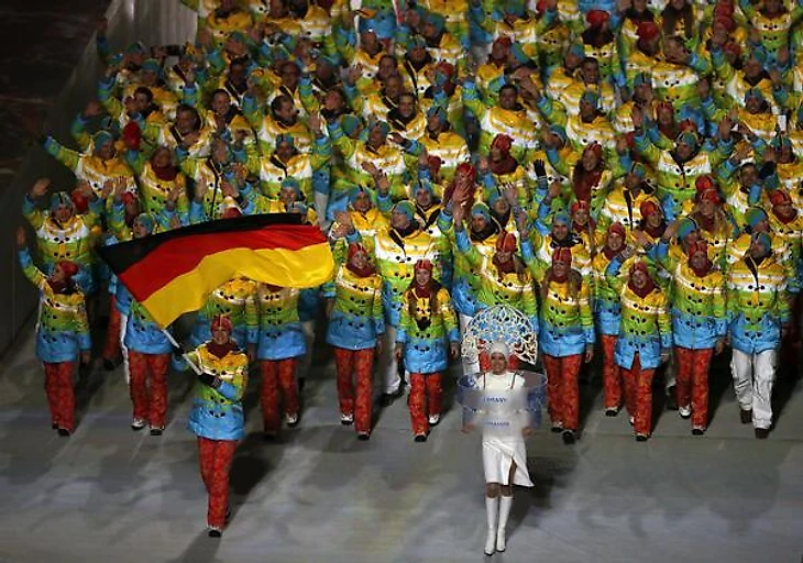 21.03 Пока показываем вам команду Великобритании в шапках-ушанках и ярких немцев.