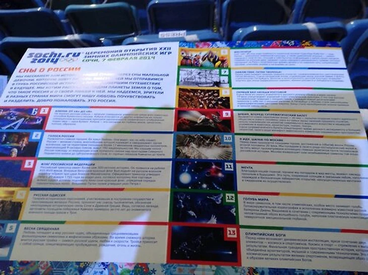 17.53 Журналистам, работающим на открытии Игр, выдают брошюру под названием «Сны о России». Она должна расшифровать некоторые моменты церемонии. Нам же все детали откроются только в 20.14.