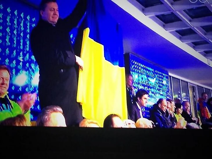 21.18 Конечно, не обходится и без большого мира политики. Президент Украины Виктор Янукович приветствует свою сборную не простым поднятием руки, а целым флагом.
