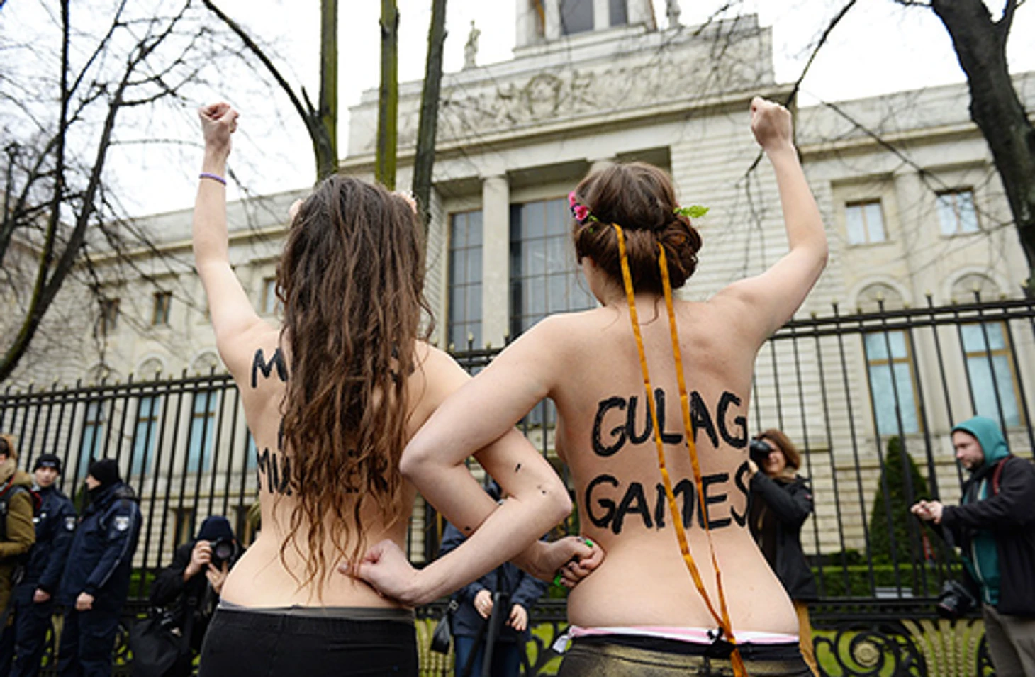 17.36 Не обошлось и без акции протеста скандального движения FEMEN. Две активистки разделись около посольства России в Берлине. На теле одной из девушек, в частности, было написано «Gulag Games».