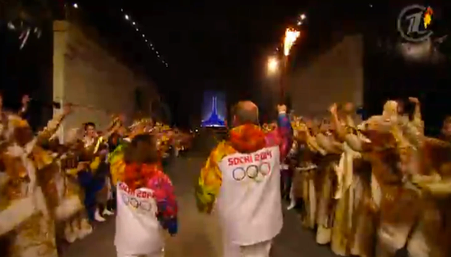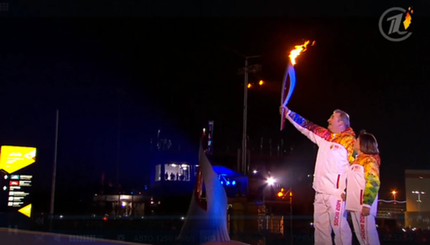 22.49 Первый этап финального этапа эстафеты олимпийского огня. В центре стадиона появляется Мария Шарапова! Следом – Елена Исинбаева. Третий – Александр Карелин.