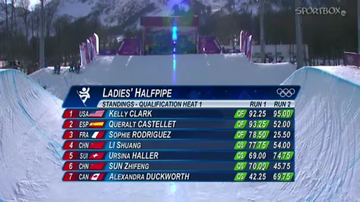 20.37 Тем временем закончился полуфинал в женском хаф-пайпе – определились еще шесть финалисток. Шарка Панчохова из Чехии, которая запомнилась яркими прыжками еще в слоупстайле, осталась за бортом.