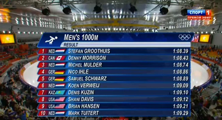 19.13 Тройка лидеров полностью изменилась за несколько минут: на первое место взобрался голландец Стефан Гротхейс (1:08.39), вторым идет канадец Деннис Моррисон (проигрывает 4 сотые), тройку замыкает победитель 500-метровки Михел Мюлдер.