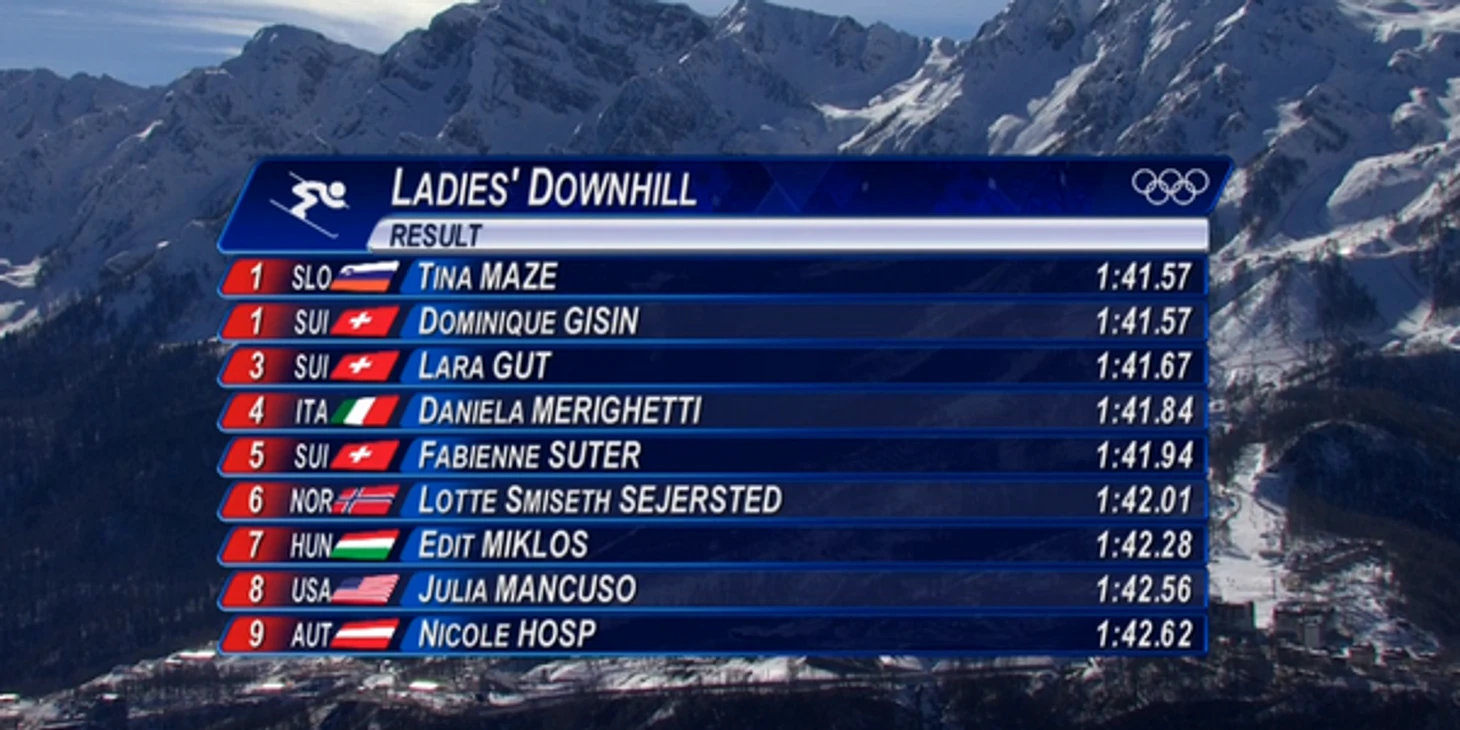 13.39 В соревнованиях горнолыжниц произошел казус: золотая медаль на трассе скоростного спуска досталась сразу паре спортсменок: Тине Мазе из Словении и Доминик Гисин из Швейцарии. На третьем месте – еще одна швейцарка Лара Гут.