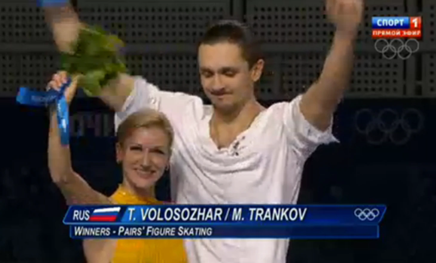 22.59 И самый важный момент – Татьяна Волосожар и Максим Траньков поднимаются на первую ступень. Большущий успех. Стадион беснуется.