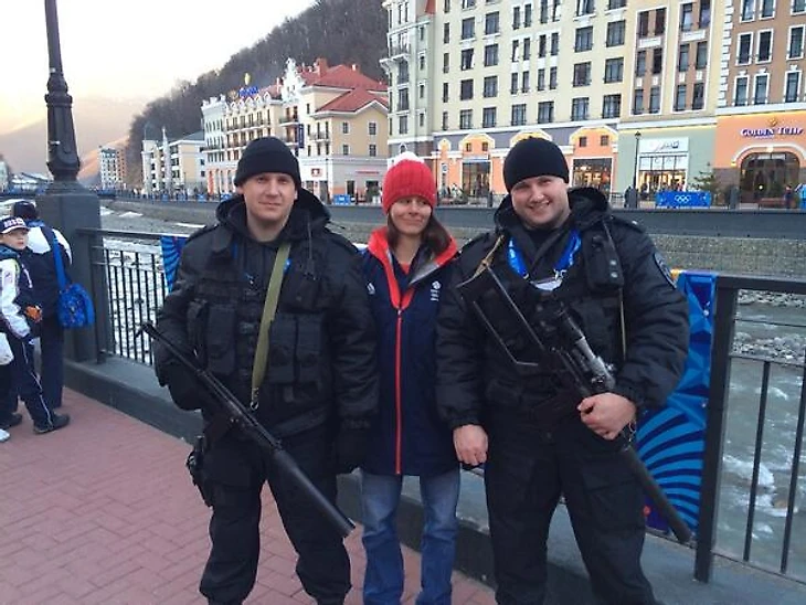 19.59 Британская сноубордистка Зои Джиллингс не смогла сдержаться и сфотографировалась с вооруженными мужчинами, которые следят за порядком в окрестностях горной олимпийской деревни.
