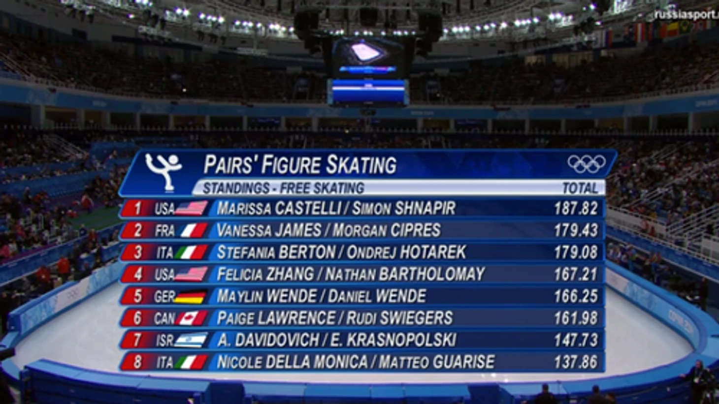 21.12 В «Айсберге» тем временем закончились выступления пар из первых двух разминок. Лидируют пока Марисса Кастелли – Саймон Шнапир из США. Все самое важное еще впереди.