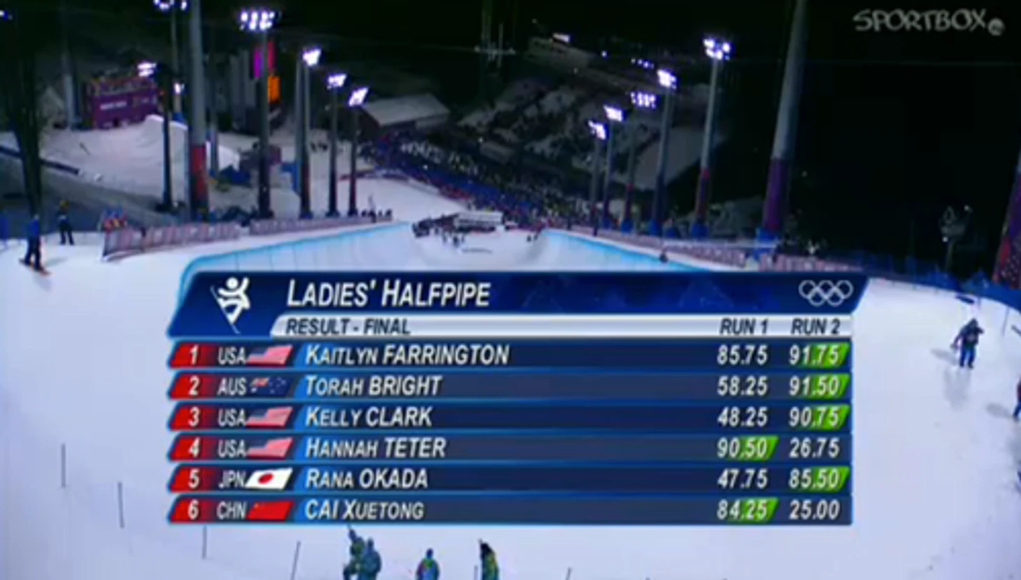 22.30 Тем временем закончился финал в женском хаф-пайпе, который принес очередное золото США. Победила Кейтлин Фаррингтон (91.75), серебро у Торы Брайт из Австралии (91.50), бронза у Келли Кларк (США) – 90.75.