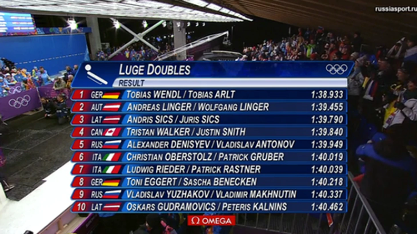 1. Тобиас Вендль – Тобиас Арлт (Германия) – 1:38.933 2. Андреас Лингер – Вольфганг Лингер (Австрия) – 1:39.455 3. Андрис Сикс – Юрис Сикс (Латвия) – 1:39.790