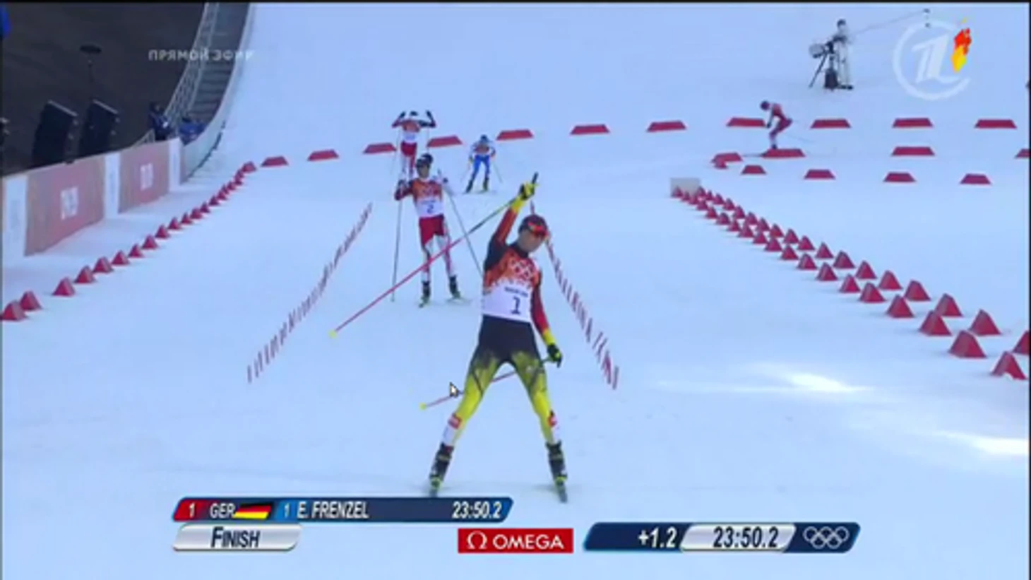 16.56. Все! Эрик Френцель здорово провел гонку и на финише улетел от японца Акито Ватабе. Бронзу взял норвежец Магнус Крог.