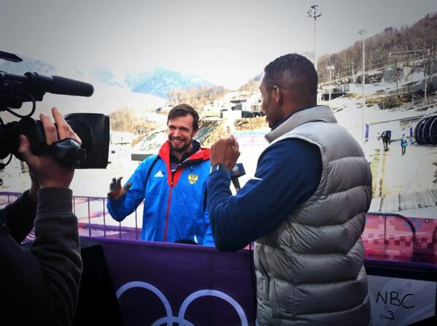 15.48 Скелетонист Александр Третьяков общается с американскими телевизионщиками.