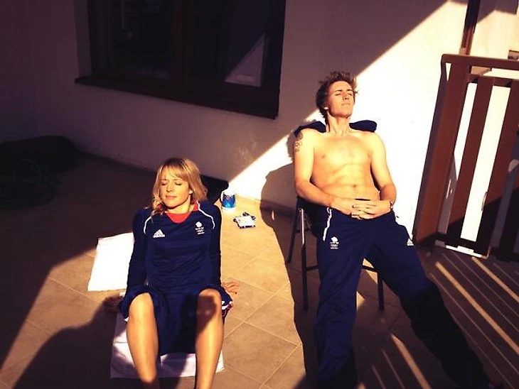17.20 Бронзовая медалистка в слоупстайле Дженни Джонс принимает солнечные ванны вместе со сноубордистом Беном Килнером.