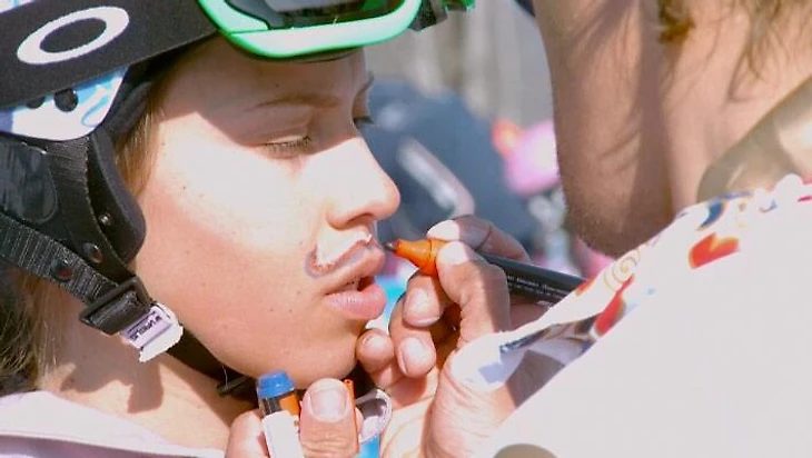13.18 Первый заезд в сноуборд-кроссе очень легко выигрывает чешка Ева Самкова. У неё есть традиция – рисовать себе усы перед каждым стартом: