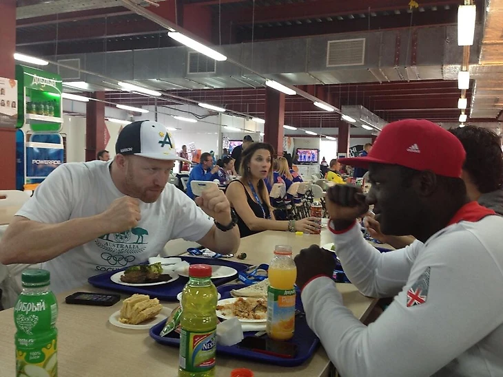 16.22 Вечером у нас стартуют бобслейные соревнования. Некоторые бобслеисты уже прониклись духом соревнования. Например, австралиец Хит Спенс и британец Ламин Дин готовы сожрать друг друга в олимпийской столовой: