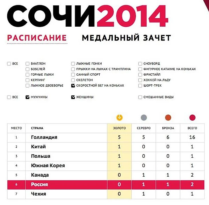 20:29 Так выглядит медальный зачет в конькобежном спорте. Голландия против остального мира. Расставить галочки по-другому можно здесь.