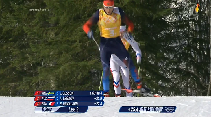 14.48 Итак, передача эстафеты Легкову! Мы отстаём на 41 секунду от шведов и финнов и на 24 секунды от чехов, которые третьи.