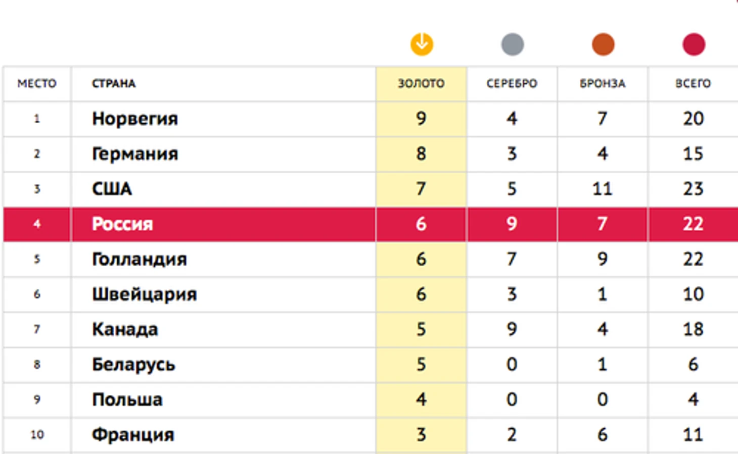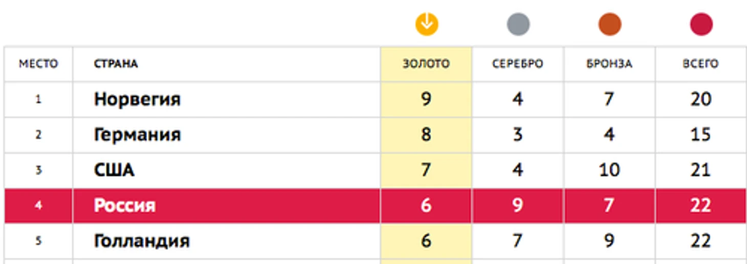 23.41 Медальный зачет сегодня возглавляет Норвегия. Россия делит с Голландией второе место по общему количеству наград. Полная таблица медального зачета