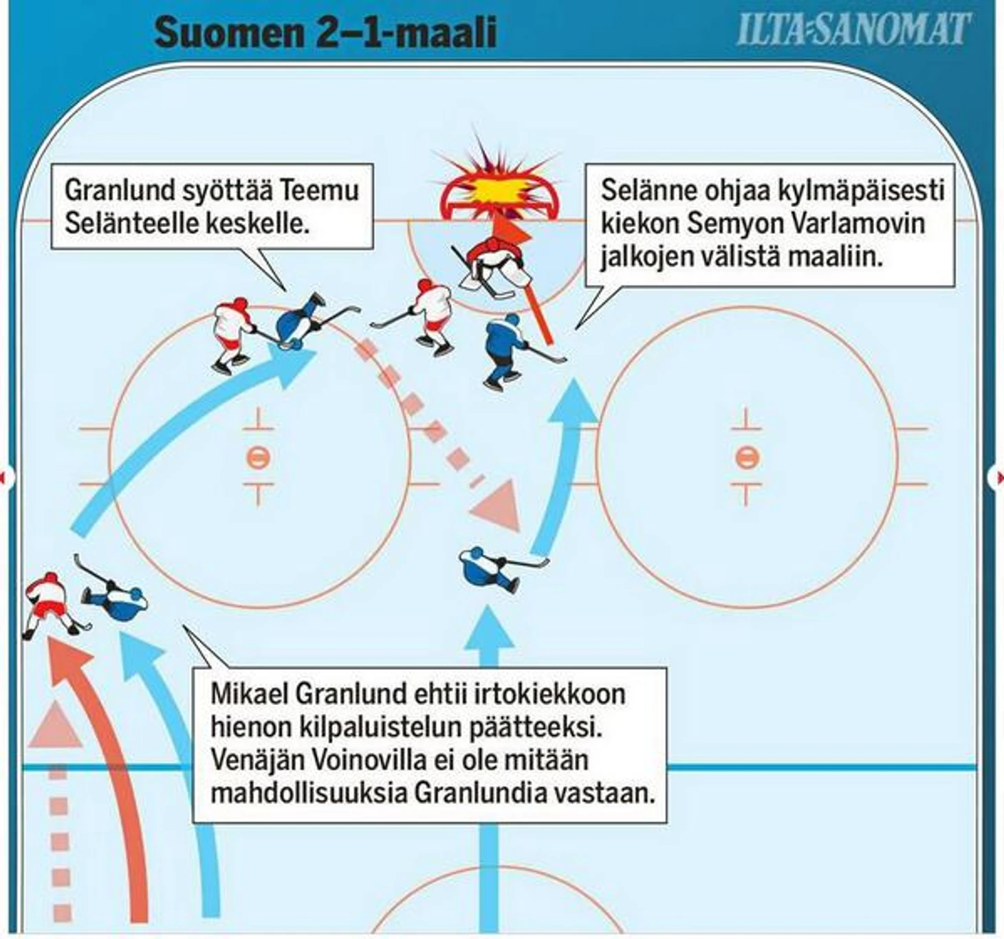 Защитник сборной США пытался вынести шайбу, но попал в своего партнера, и та рикошетом залетела в ворота. Гол записан на Алеша Гемски.