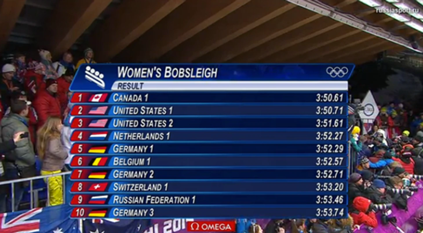 22.11 Тренерский штаб сборной Канады ликует – ведь после второго заезда их экипаж проигрывал США 0,23 секунды.