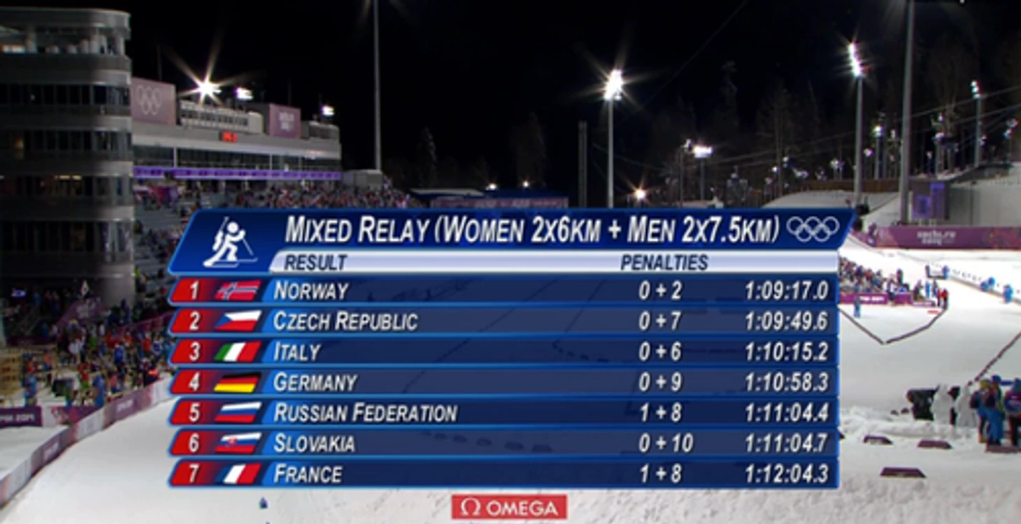 19.52 Сборная Норвегии благодаря сегодняшней победе вышла на первое место в медальном зачете. По общему количеству медалей лидерство у России и Голландии (22).