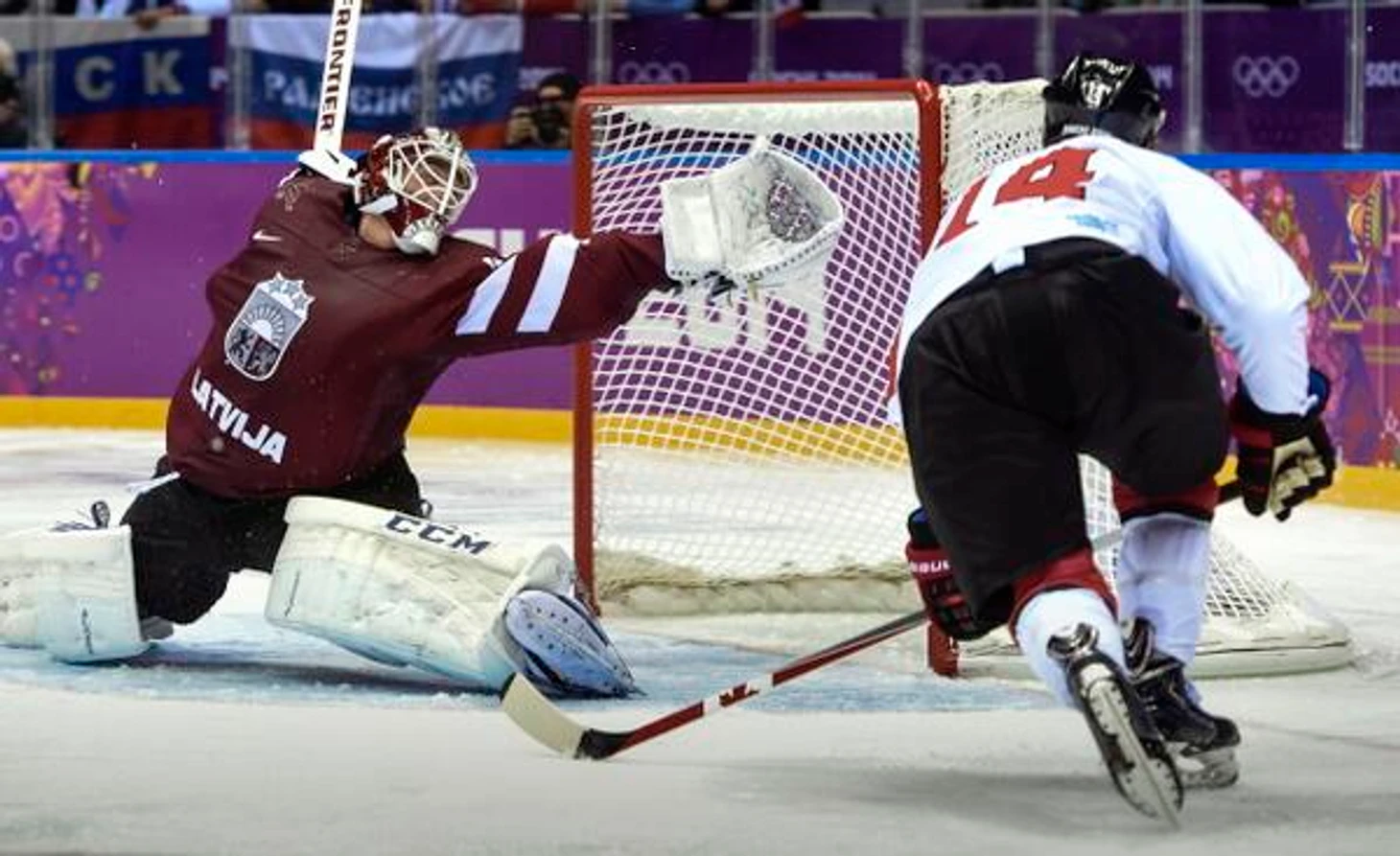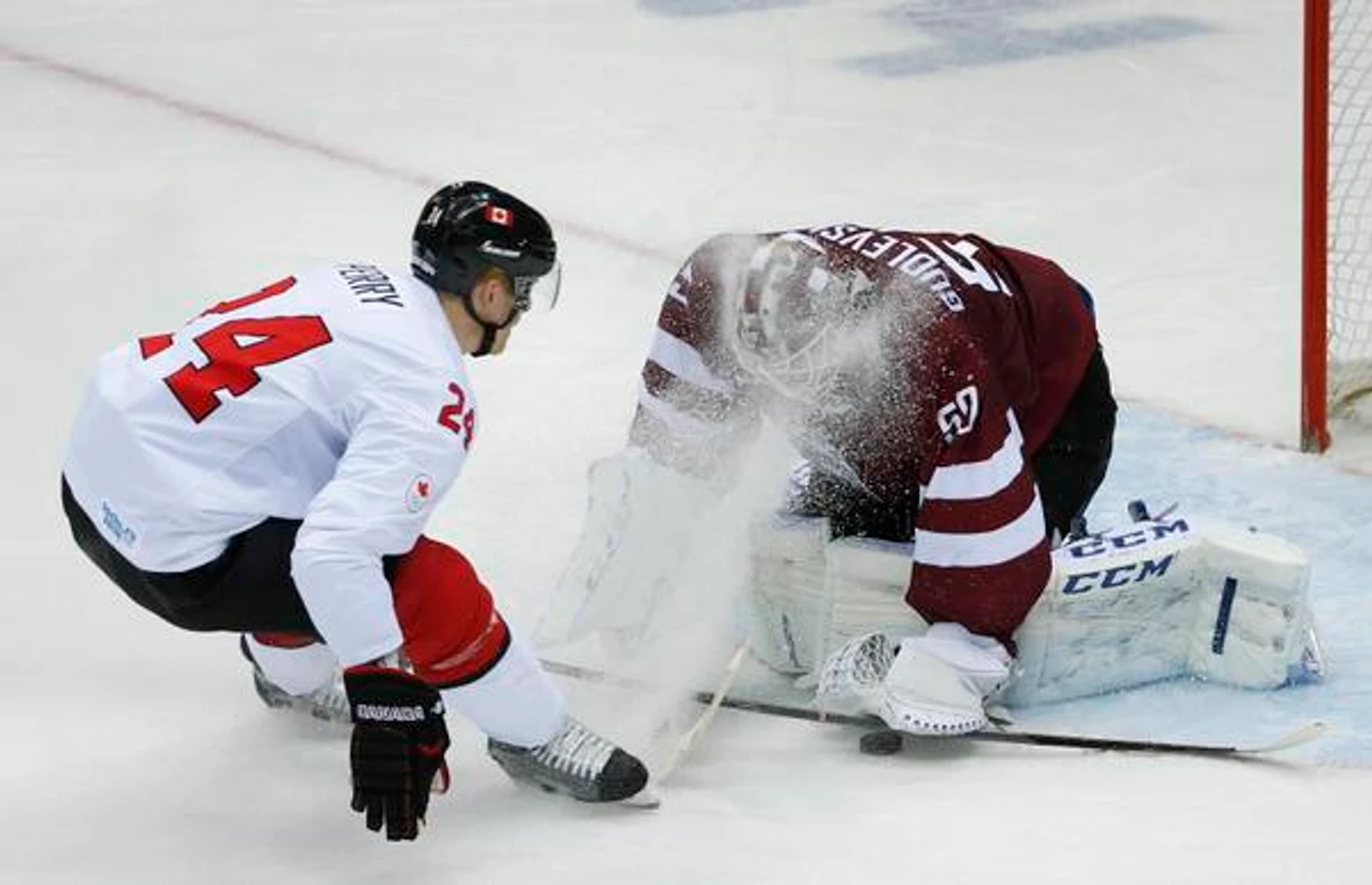 21.49 Еще один впечатляющий кадр – Канада пытается запугать Латвию (пока счет 1:1). За такой трюк Перри удален не был. Судья не усмотрел здесь неспортивное поведение.
