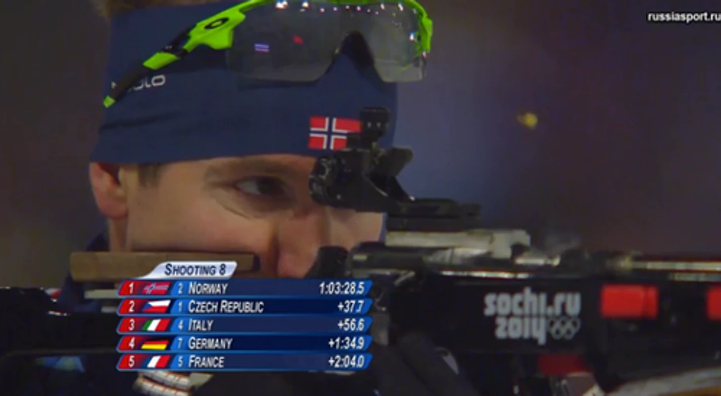 19.26 Норвегия продолжает мчаться к золоту: Свенсен чисто отстрелял лежку и убежал на дистанцию в одиночестве.