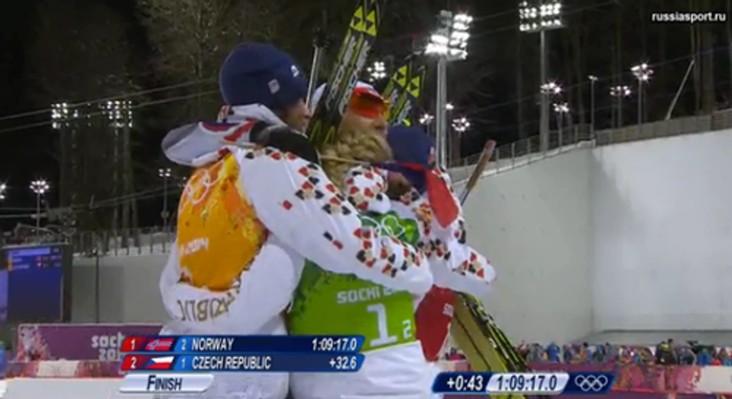 19.40 Все, Норвегия финиширует первой в смешанной эстафете. Свенсен не стал брать флаг и обнимается со своей командой.