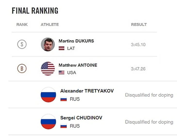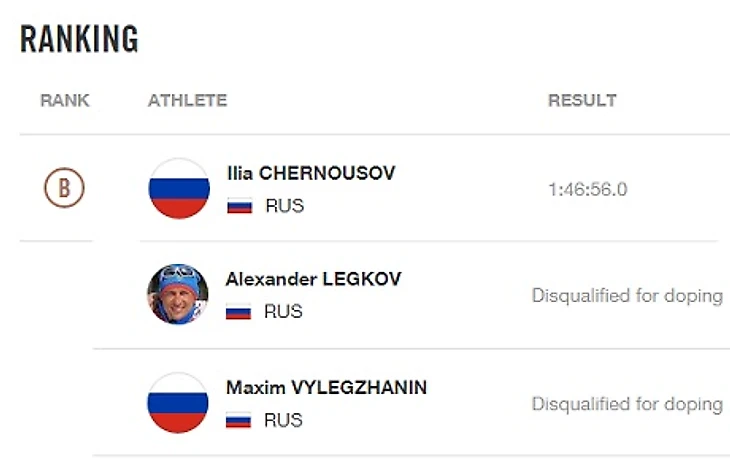 Однако на официальном сайте МОК результаты этих спортсменов отсутствуют. Например, в мужском скелетоне указаны только серебряный и бронзовый призер, чемпион Игр Александр Третьяков есть в самом конце списка с пометкой «дисквалифицирован за допинг».