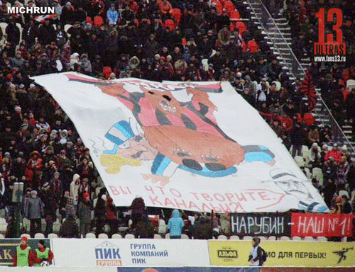 Пермский медведь и Михаил Боярский, фанаты «Москвы», поздравляющие с профессиональным праздником, недобитый Рокки, поддерживающий «Спартак» в фотогалерее Sports.ru, фиксирующей фанатскую активность в матчах 28-го тура премьер-лиги.-