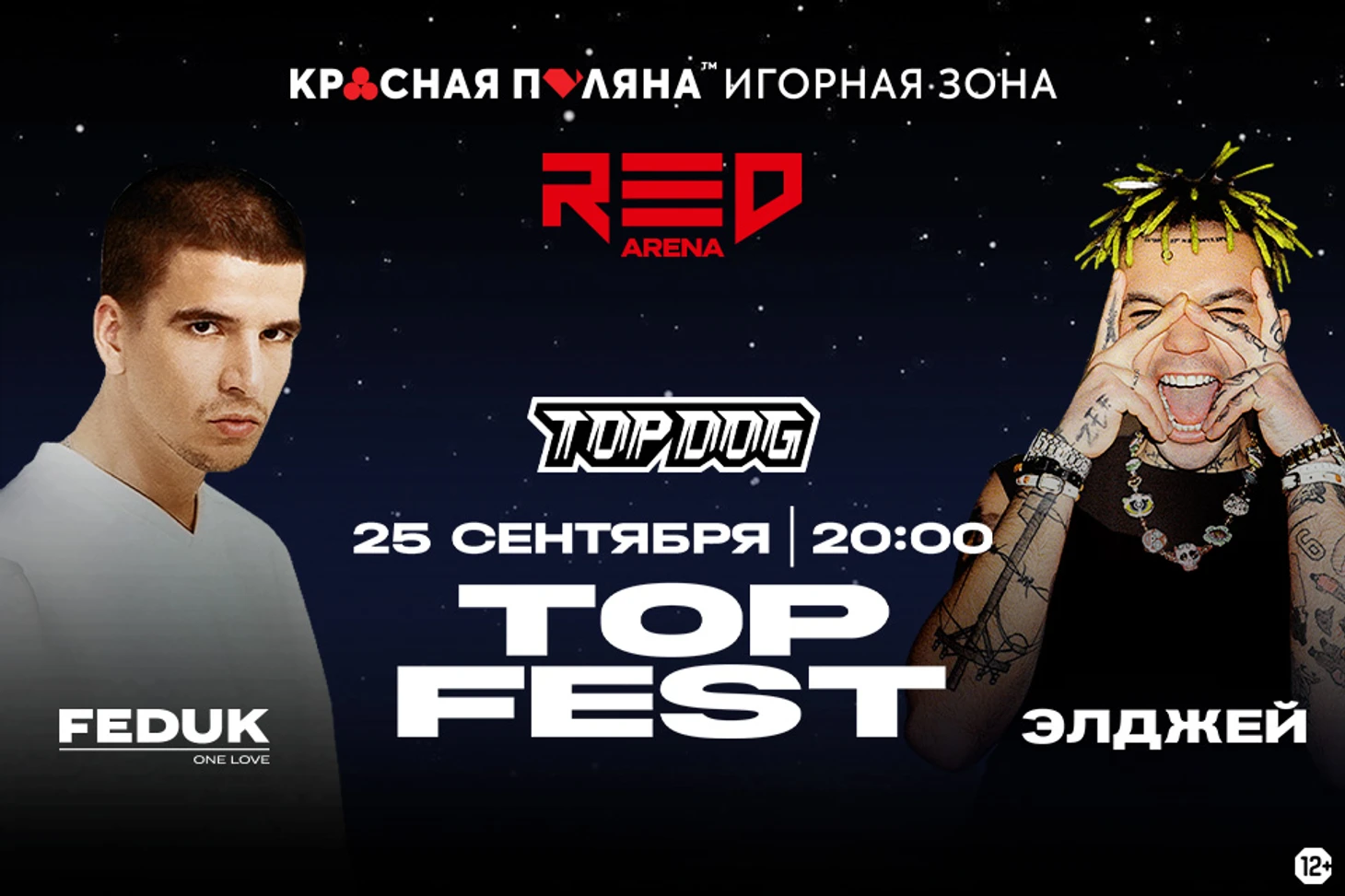 Кроме того, впервые в Сочи состоится самый масштабный турнир боев на голых кулаках TOP DOG FC 16. Грандиозное событие в мире спорта пройдет в RED ARENA. На следующий день после поединков состоится музыкальный фестиваль TOP FEST: на сцену выйдут звёздные рэперы Элджей и Feduk.
