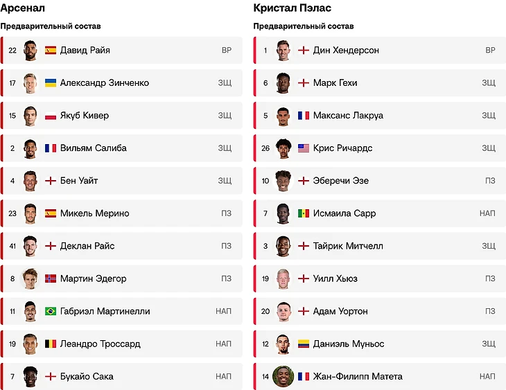 После матча с Реалом Артета почти не ротировал состав – возможно, против Пэлас увидим в старте чуть больше неожиданностей, хотя особой необходимости для Арсенала нет: перед матчем с ПСЖ у команды будет неделя отдыха.
