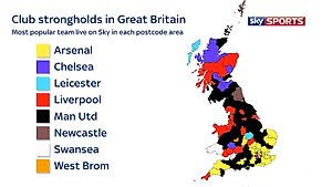 Центральная Англия поделена в основном #Манчестер Юнайтед и #Ливерпуль за #Арсенал почти весь юг. На заселенном в основном овцами севере Шотландии появляется #Челси. ... Читать дальше Посчитано по зрительским предпочтениям подписчиков Sky Sports, а это почти 9 млн домохозяйств. #телевидение